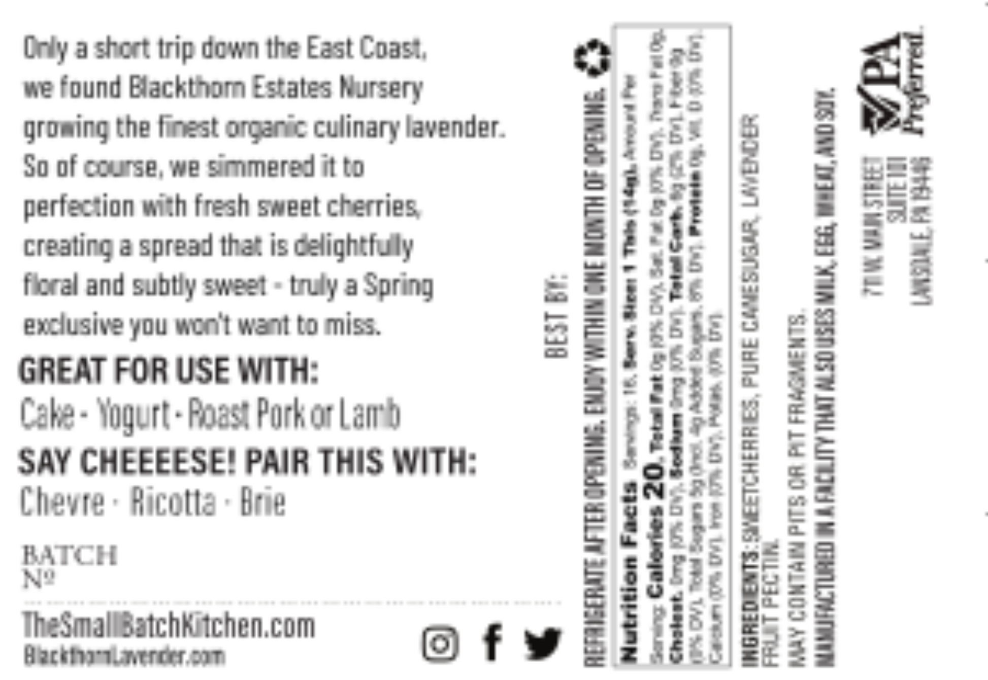 Ingredients: Sweet Cherries, Pure Cane Sugar, Lavender, Fruit Pectin.